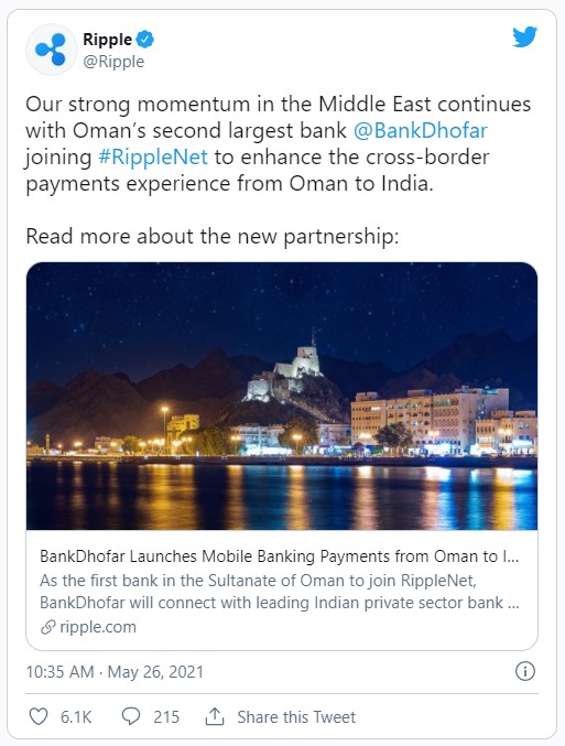 علیرغم پرونده شکایت کمیسیون SEC از ریپل، این شرکت فعالیتهای خود را در سطح جهان گسترش میدهد. این شرکت در روز گذشته توییتی منتشر کرد که بر اساس آن، BankDhofar بزرگترین بانک عمان، خدمات پرداخت بانکی همراه را از کشور عمان به هند با استفاده از ریپلنت (RippleNet) راهاندازی کرده است.