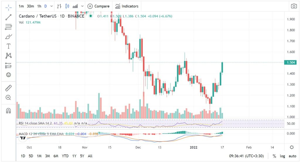با توجه به اینکه احساسات پیرامون کاردانو همچنان قوی است به نظر میرسد ADA به دنبال آزمایش مقاومت ۱.۵ دلاری پیش روی خود حرکت میکند. شاخص RSI سقفهای بالاتری را ثبت کرده است و از میزان ۵۰ فراتر رفته است.