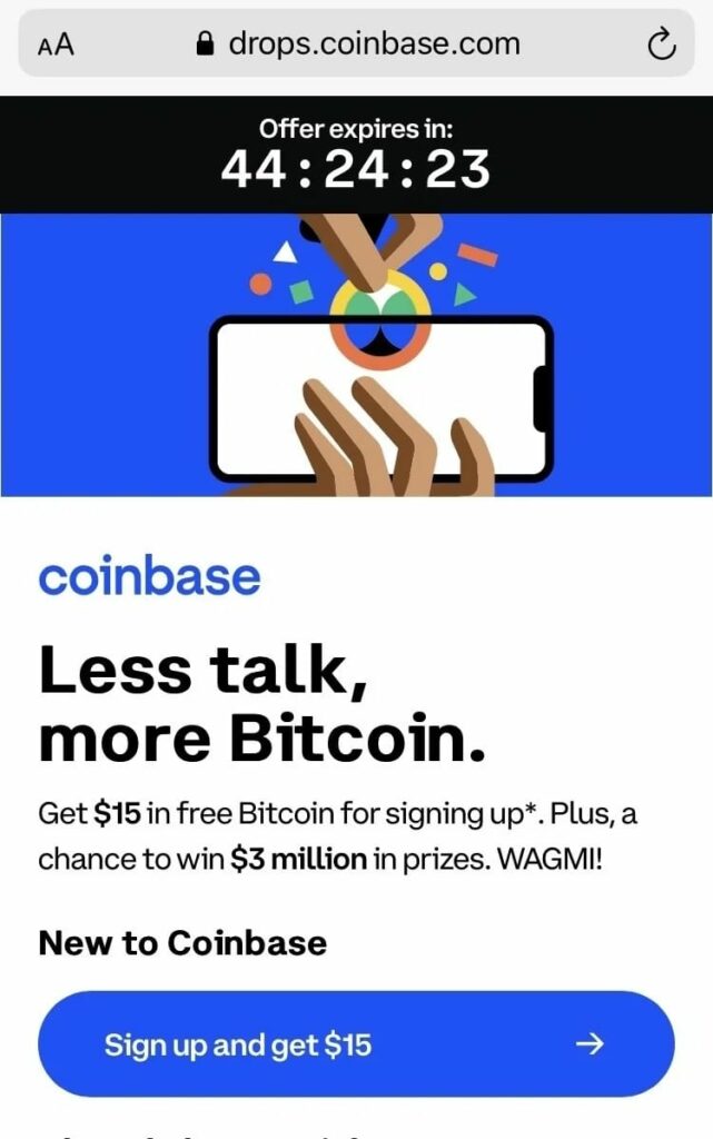 تبلیغ صرافی کوین بیس و اهدا ۱۵ دلار بیت کوین به صورت رایگان