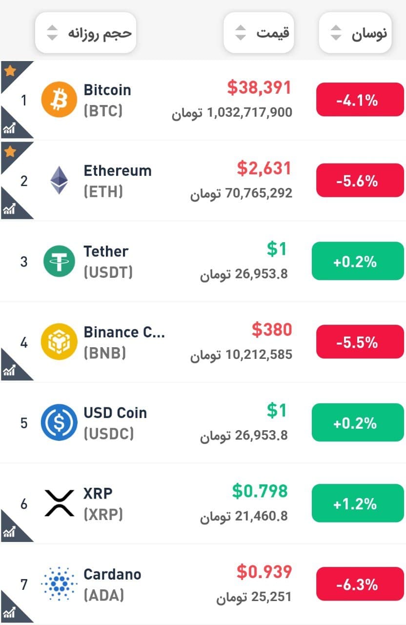 بیت کوین به زیر 39هزار دلار سقوط کرد واین سقوط باعث لکویید 97میلیاردی شد وریپل کمترین ریزش را در بین در ارز برتر داشته است