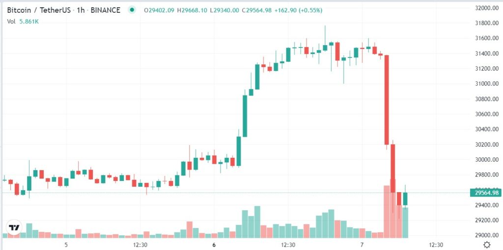 در چند ساعت گذشته قیمت بیت کوین با کاهش ۷٪ از سطح ۳۱٬۵۰۰ دلار تا کف ۲۹٬۱۰۰ دلاری کاهش یافته است. در حالیکه روز گذشته ارز دیجیتال بیت کوین توانست پس پشت سر گذاشتن ۹ هفته متوالی قرمز رنگ، کندل هفتگی خود را به رنگ سبز ثبت کند و امیدها را به تریدرها بازگرداند و حتی از سد سطح ۳۱٬۰۰۰ دلاری عبور کند، اما این رشد آنچنان هم ادامه دار نبود.