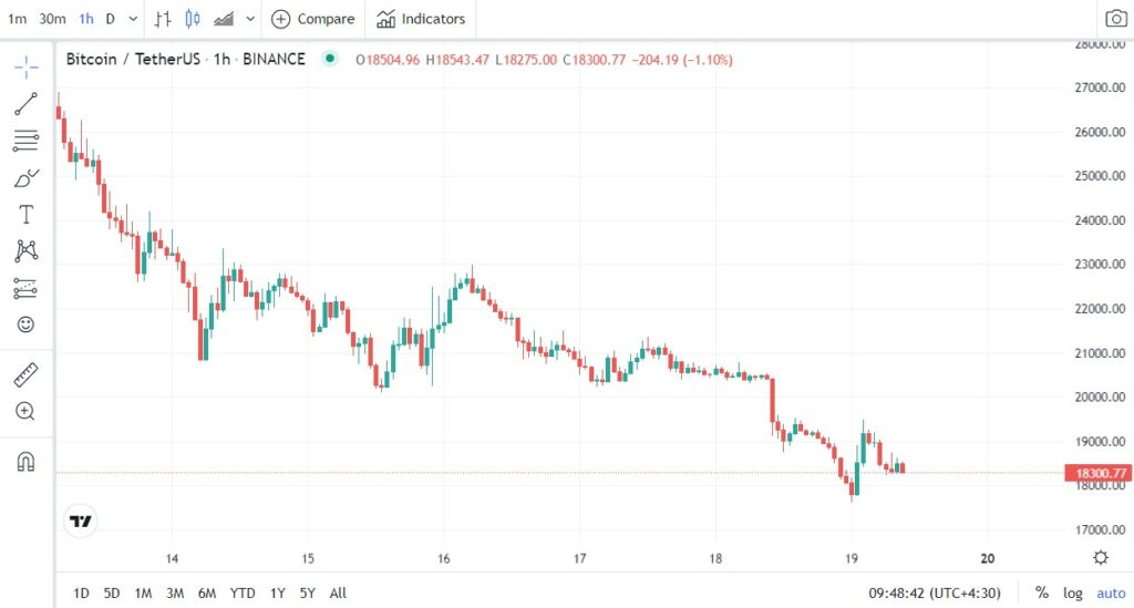 به نقل از کوین تلگراف، قیمت بیت کوین روز یکشنبه حمایت کلیدی ۲۰٬۰۰۰ دلار را از دست داد. یک ساعت بعد قیمت اتریوم هم آن را تعقیب کرد و به زیر ۱۰۰۰ دلار رسید. پس از اندکی توقف، یک حرکت نزولی دیگر آغاز شد که در ساعت ۳۰ دقیقه بامداد دوشنبه قیمت ۱۷٬۷۷۲ دلار را برای بیتکوین و اندکی قبل از آن قیمت ۸۹۸ دلار را برای اتر ثبت کرد.