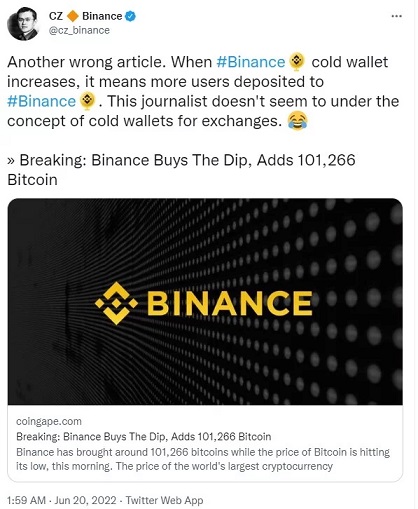 همزمان با کاهش قیمت بیت کوین به زیر سطح ۱۹٬۰۰۰ دلار، بایننس میزان بیش از ۱۰۰٬۰۰۰ BTC را به کیف پول سرد خود منتقل کرده است. برخی خبرگزاریها مانند کوین گپ عنوان کرده بودند که صرافی بایننس اقدام به خرید بیتکوین در کف قیمت کرده است. شاید رشد قیمت ارز دیجیتال BTC در روز گذشته ناشی از این صحبتها بوده باشد. اما چانگ پنگ ژائو (CZ) مدیر عامل این صرافی، در توییتی با رد این شایعه عنوان داشت:
