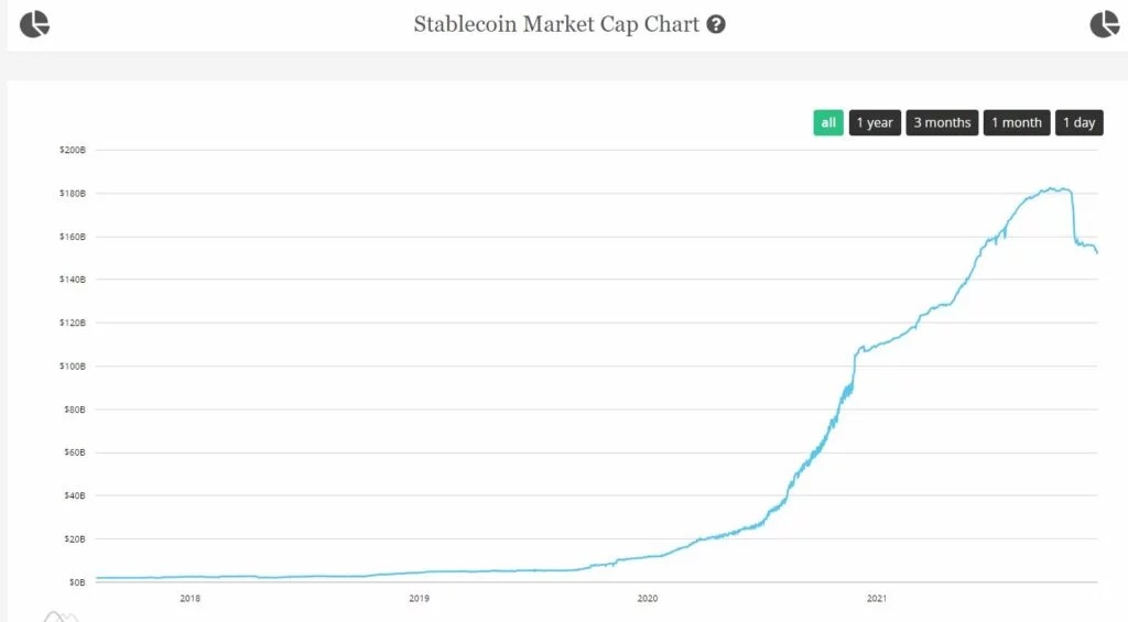 در حال حاضر ارزش کل بازار (مارکت کپ) استیبل کوینها برابر حدود ۱۵۶ میلیارد دلار است که در میان آنها تتر با ۶۸ میلیارد دلار بیشترین سهم را دارد. کاهش این پارامتر نسبت به ماه آپریل (اردیبهشت) در کنار کاهش ارزش کل بازار کریپتو نشاندهنده این موضوع است که بخشی از سرمایههای این بازار به پول فیات تبدیل شده و از این بازار خارج گشته است.
