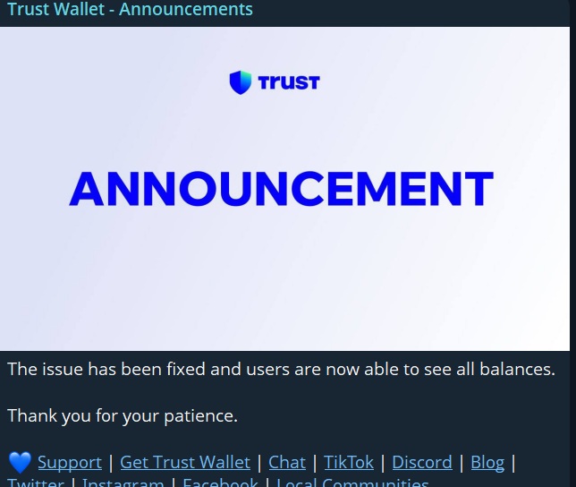 تیم توسعهدهنده تراست ولت در بیانیه رسمی جدید خود تأیید کرد که مشکل فنی اکنون برطرف شده و کاربران میتوانند مجدداً موجودی کامل رمزارزهای خود را مشاهده کنند.