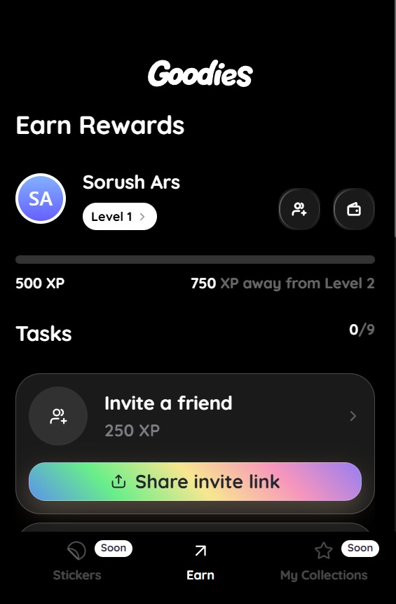 پس از ورود، با انجام ۹ تسک ساده مثل فالو کردن صفحات رسمی یا عضویت در کانالهای معرفیشده، میتوانید در کمتر از چند دقیقه به سطح ۵ برسید. اگر خودتان را تا لول ۳ یا بالاتر برسانید، این شانس را دارید که در کالکشنهای اولیه Goodies قرار بگیرید و وایتلیست (whitelist) شوید؛ جایی که معمولاً بیشترین رشد قیمتی اتفاق میافتد.