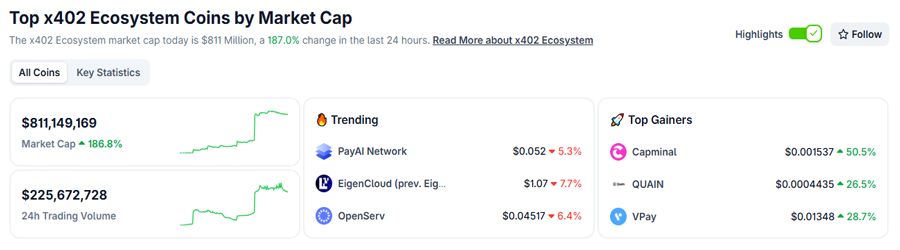 استقبال بازار از توکنهای x402 چشمگیر بوده است. پس از تأسیس بنیاد x402 توسط شرکتهای مطرحی همچون کوینبیس (Coinbase) و کلودفلر (Cloudflare)، حجم تراکنشها و معاملات این اکوسیستم به سرعت افزایش یافت. طبق دادههای کوینگکو، ارزش بازار توکنهای x402 به بیش از ۸۱۱ میلیون دلار رسیده و حجم معاملات روزانه آن نیز بیش از ۲۲۵ میلیون دلار گزارش شده است.