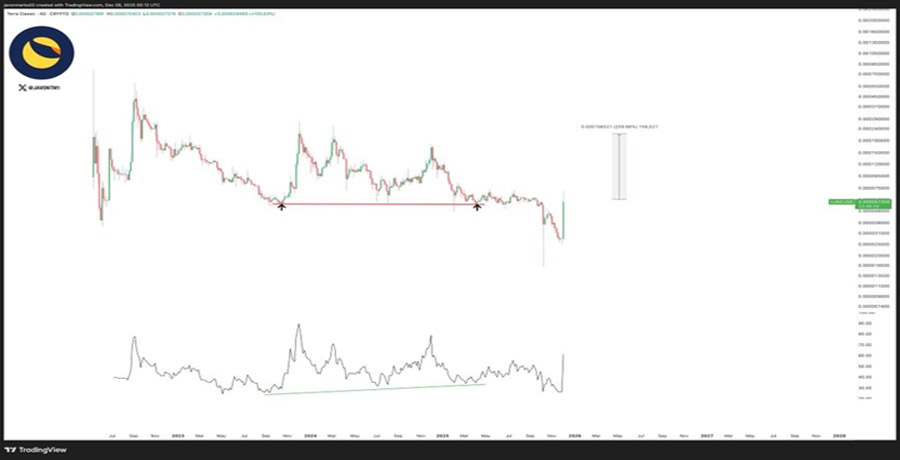 پس از ماهها سکوت، اکوسیستم ترا دوباره در مرکز توجه قرار گرفت؛ چرا که ترا لونا (LUNA) و ترا لونا کلاسیک (LUNC) جهشهای شدیدی را تجربه کردند. LUNA با صعود نزدیک به ۷۰ درصد به محدوده ۰.۱۱ دلار رسید و LUNC نیز با رالی ۱۲۲ درصدی بازار را شگفتزده کرد.